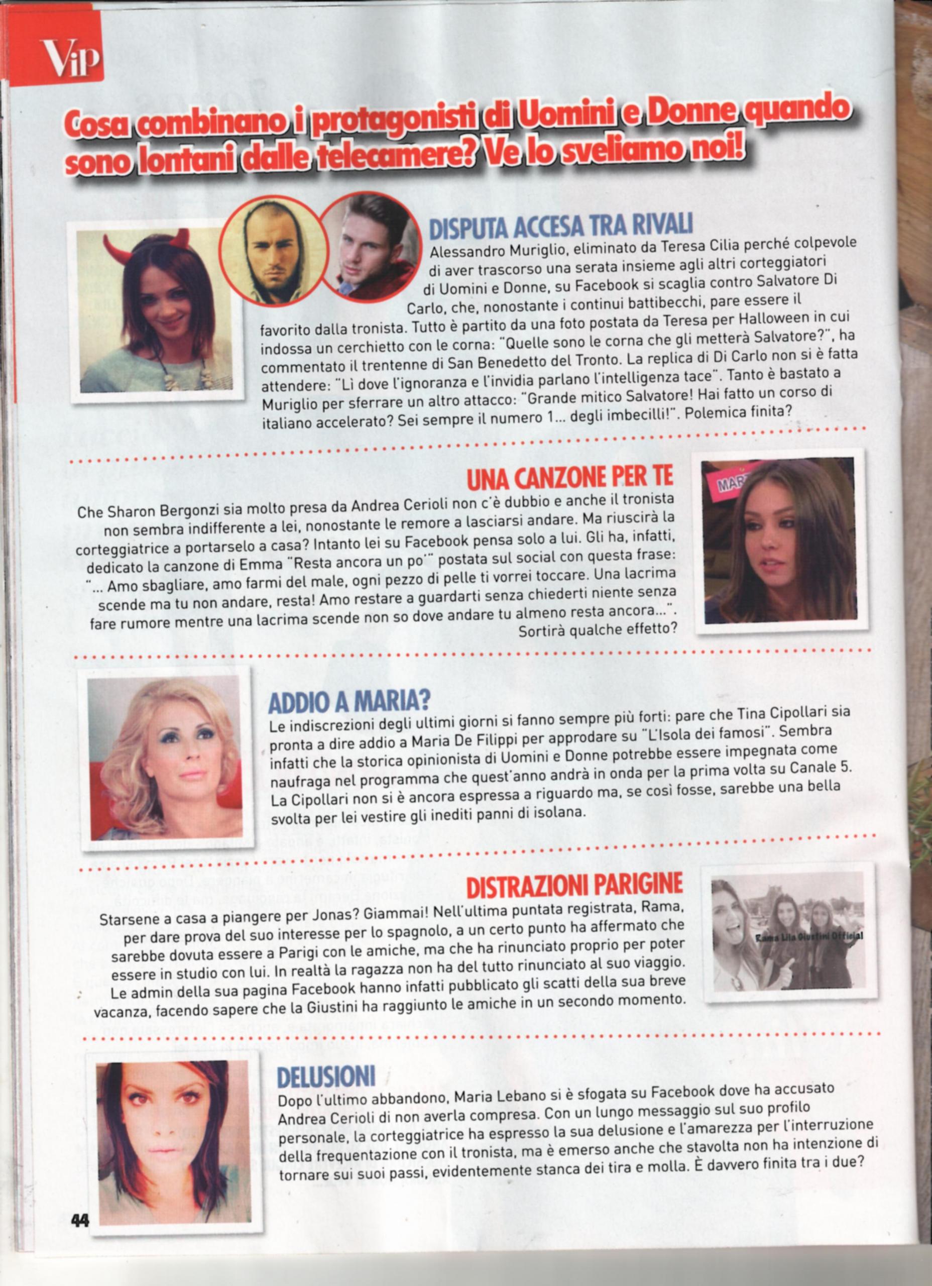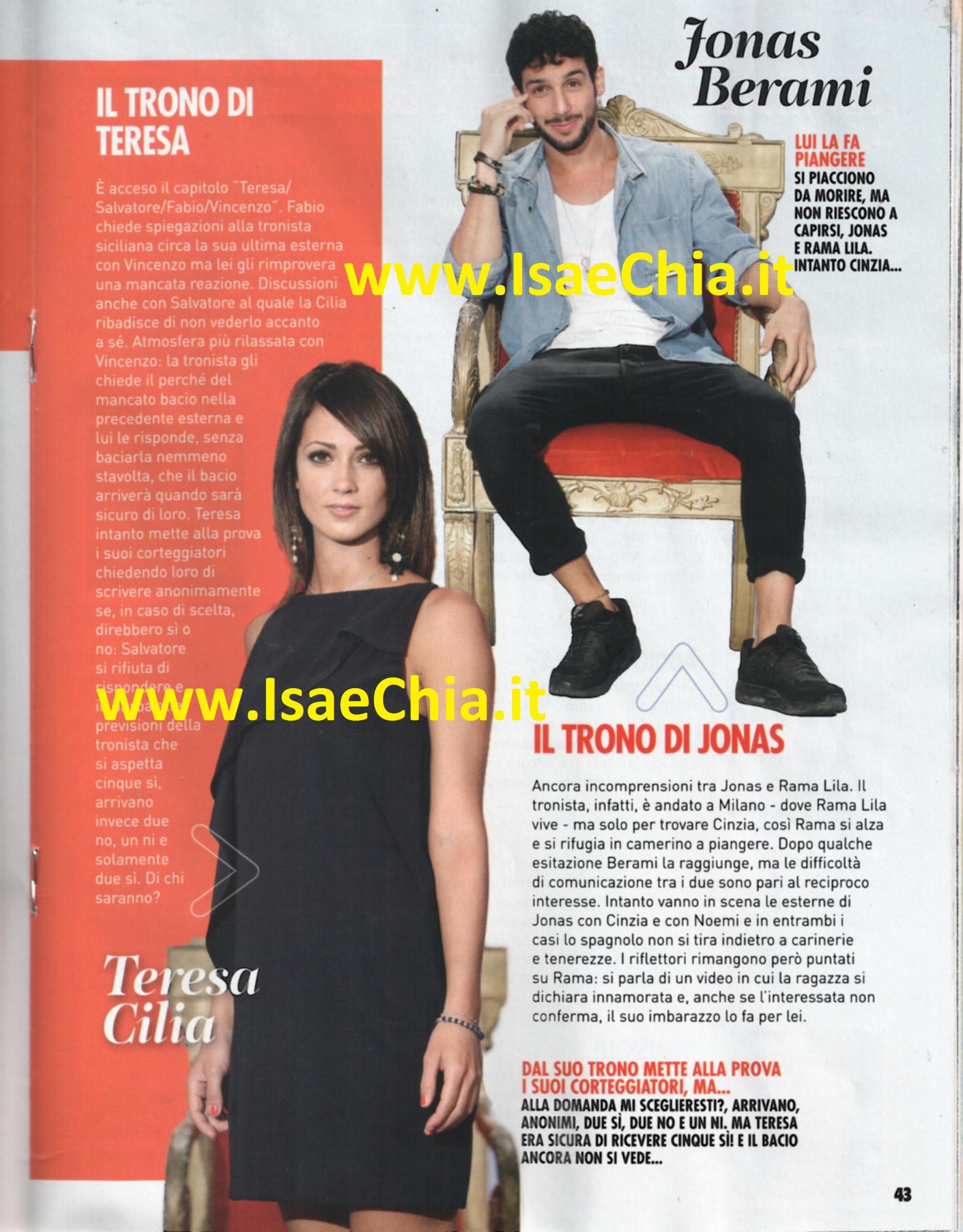 Situazione forse ancor più complessa quella di Teresa Cilia: la bella siciliana è sicuramente presa da Salvatore Di Carlo, ma le discussioni continue con lui l’hanno portata ad affermare di non vederlo accanto a sé. A Vincenzo Lucignano, invece, Teresa chiede il perché del mancato bacio nella precedente esterna e lui risponde che arriverà quando sarà sicuro di loro. Nel frattempo, rivela che le dirà di sì. Per quanto riguarda l’argentino Fabio Colloricchio, lui chiede spiegazioni per l’esterna con Vincenzo e le dimostra interesse, ma nel frattempo arrivano segnalazioni su di lui, che lo vorrebbero interessato alle serate in discoteca.