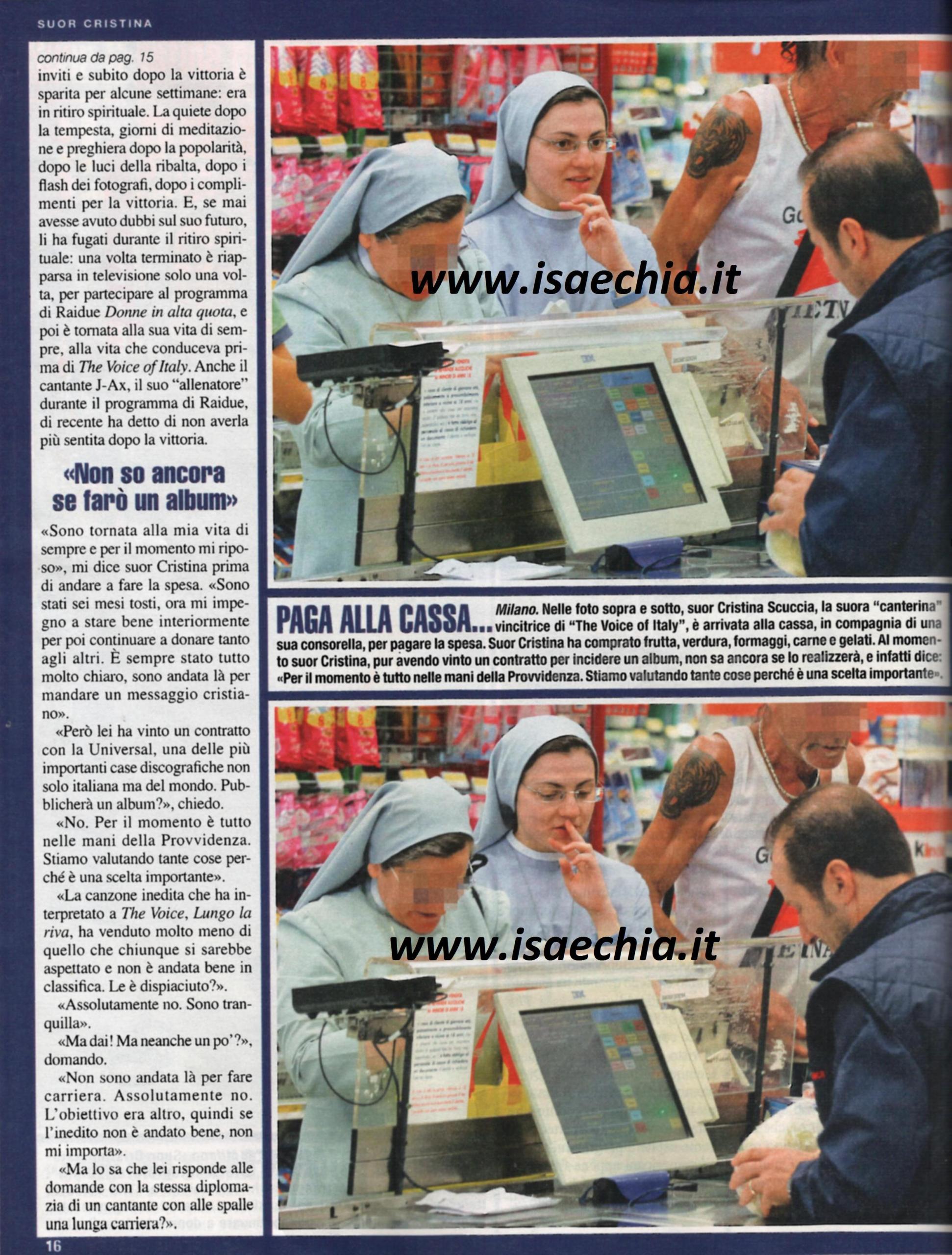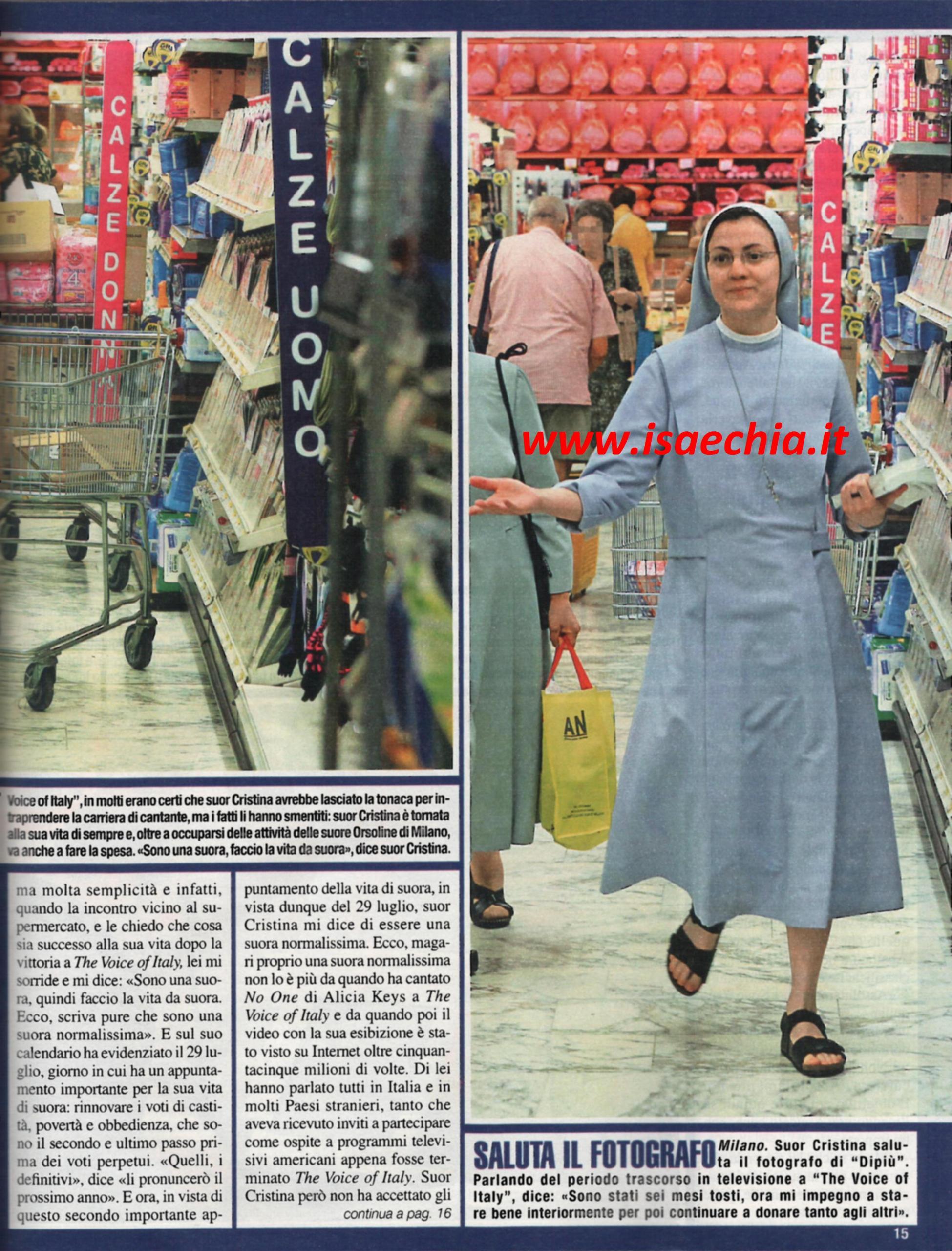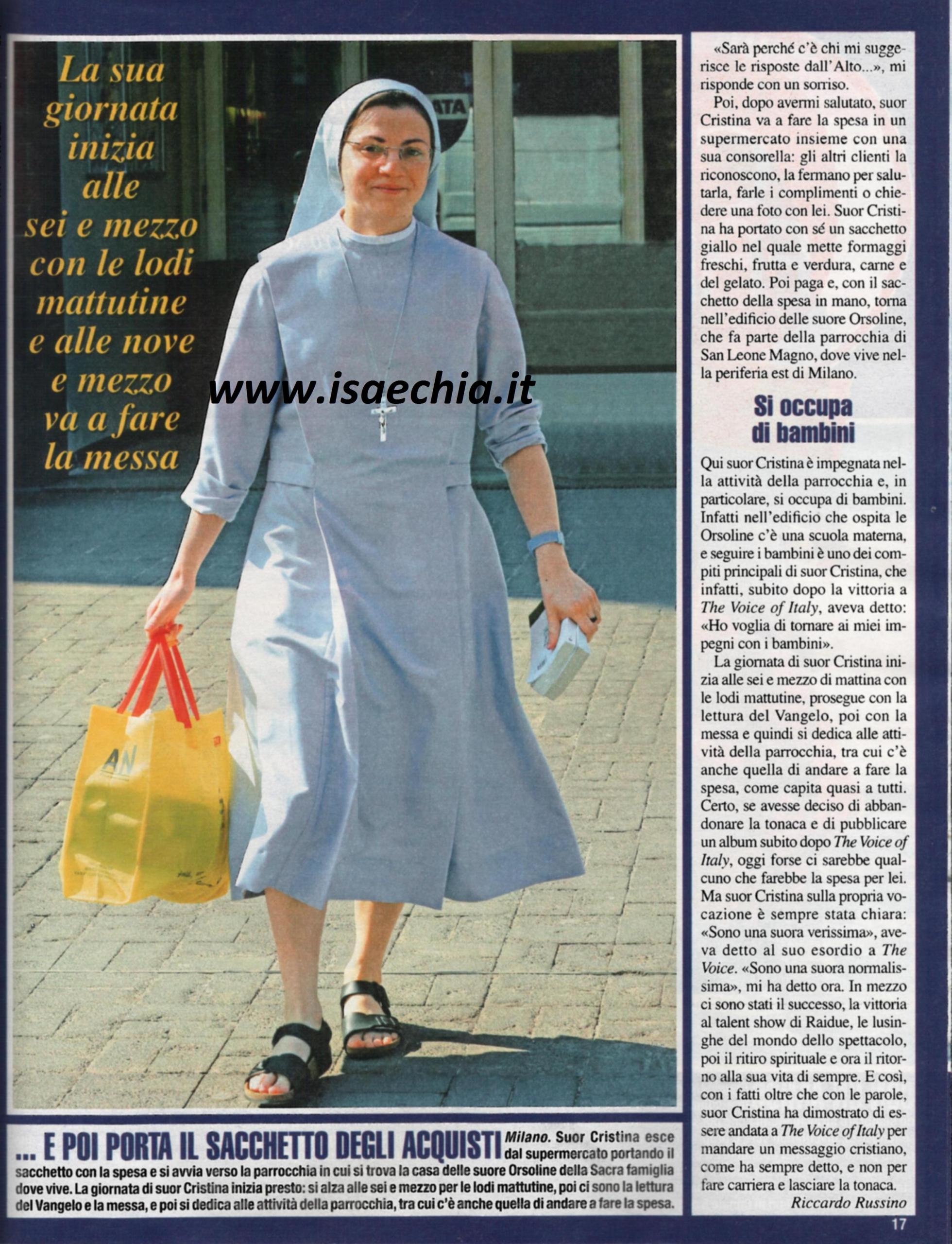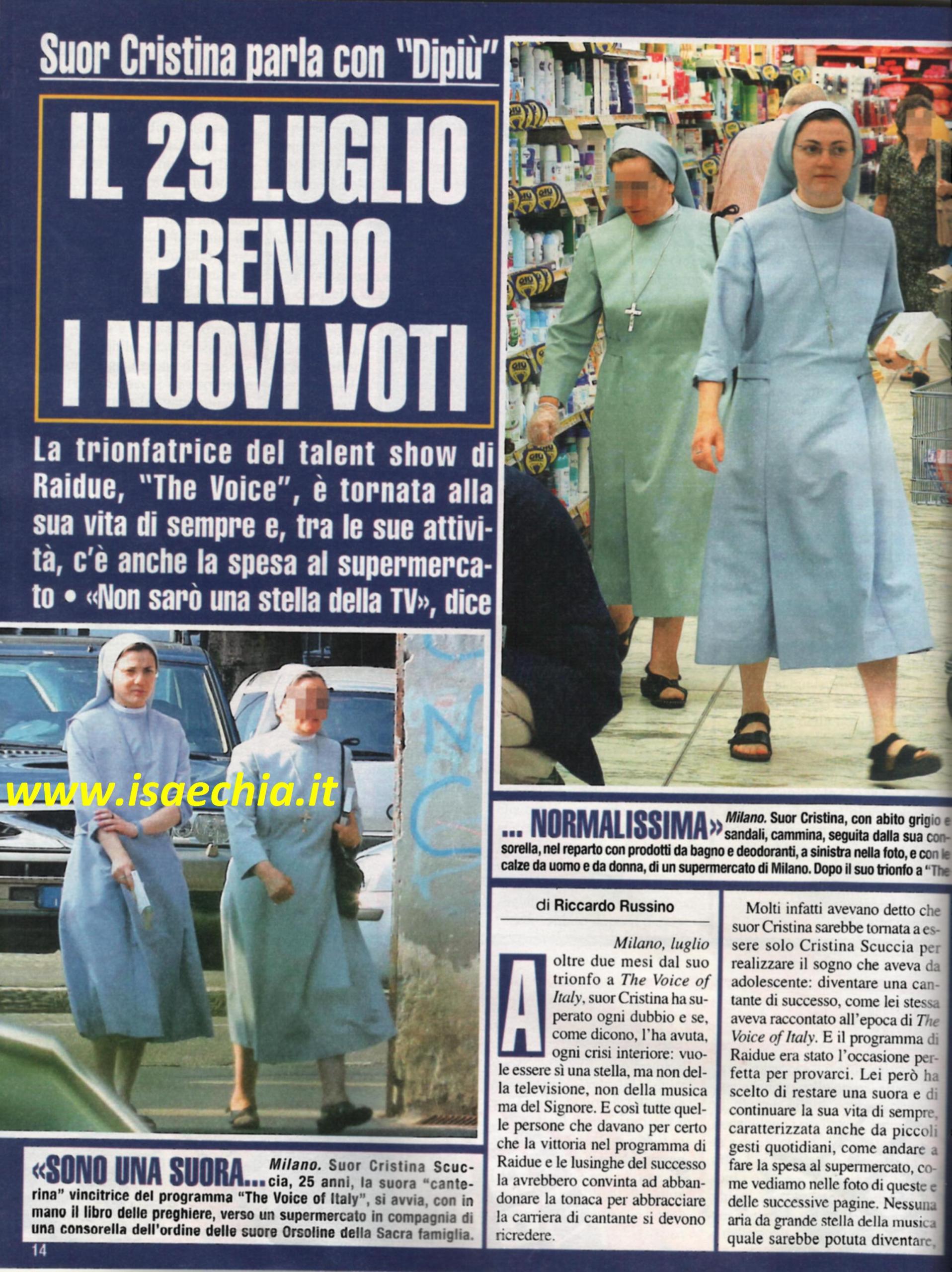 E’ stata il fenomeno mediatico dell’anno, Suor Cristina Scuccia, vincitrice della seconda edizione di The Voice of Italy. Ma, se tutti davano per scontato che, abbagliata dai riflettori, la suora cantante avrebbe presto abbandonato i voti, a due mesi dalla fine del programma i fatti stanno ben diversamente. Lei ha scelto di continuare la sua vita di sempre, caratterizzata anche da piccoli gesti quotidiani. Eccola, ad esempio, a Milano, mentre fa la spesa al supermercato insieme ad una consorella, in tunica grigia e sandali. Intervistata, ha risposto: “Sono una suora e faccio la vita da suora. Ecco, scriva pure che sono una suora normalissima”. Infatti, oggi, 29 luglio, Suor Cristina rinnoverà i suoi voti di castità, povertà e obbedienza, che sono il secondo e ultimo passo verso i voti perpetui: “I definitivi li pronuncerò il prossimo anno” spiega lei. Così, dopo aver provato le luci della ribalta, si è messa in ritiro spirituale ed è tornata in tv solo una volta, per partecipare a Donne in alta quota: “Sono tornata alla mia vita di sempre. Sono stati mesi tosti, ora mi riposo e mi impegno a star bene interiormente per poter donare agli altri. E’ sempre stato tutto chiaro: sono andata lì per dare un messaggio cristiano. Un album? No, per il momento è tutto nelle mani della Provvidenza. Stiamo valutando tante cose, è una scelta importante. Non sono dispiaciuta che il singolo lanciato a The voice non sia andato bene in classifica, non sono andata lì a fare carriera”. Poi, dopo aver fatto la spesa, Suor Cristina si ritira nell’edificio delle suore Orsoline, che fa parte della parrocchia di San Leone Magno. Qui lei si dedica alle attività di parrocchia, in particolare ai bambini della scuola materna. La sua giornata inizia alle 6,30 con le lodi, poi la lettura del Vangelo e poi le attività di parrocchia. Insomma, la vita di una suora “verissima” e “normalissima”, come si è definita lei…