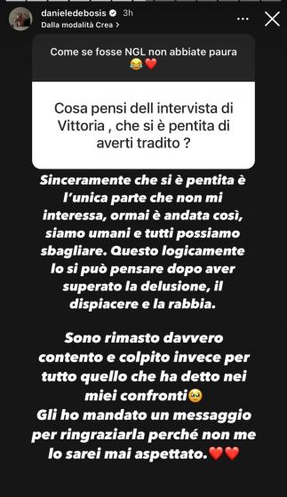 Nelle scorse ore, durante una chiacchierata con i sui follower, Daniele ha risposto a un utente che gli aveva chiesto cosa ne pensasse dell’intervista della sua ex compagna.