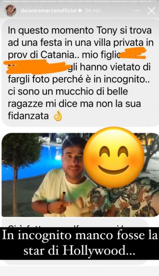 Nella prima un utente ha svelato che Tony si trovava in una festa all’interno di una villa privata in Sicilia, circondato da diverse belle ragazze, ma non dalla sua fidanzata: