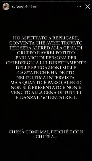 Ho aspettato a replicare, convinta che avrei trovato ieri sera Alfred alla cena di gruppo e avrei potuto parlarci di persona per chiedergli a lui direttamente delle spiegazioni sulle caz** ate che ha detto nell’ultima intervista. Ma a quanto è parso, Alfred non si è presentato e non è venuto alla cena di tutti i ‘fidanzati’ e ‘tentatrici. Chissà come mai, perché e con chi era…