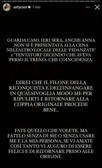 Guarda caso, ieri sera, anche Anna (Acciardi, ndr) non si è presentata alla cena nell’altro locale delle ‘fidanzate’ e ‘tentatori’ dicendo che aveva perso il treno… che coincidenza. Direi che il filone della riconquista e dell’infangare in qualsivoglia modo me per ripulirti e ritornare alla coppia originale procede bene. Fate quello che volete, ma fatelo senza di me o senza usare me e la mia persona, se vi amate così tanto vi auguro di essere felici e di ritornare presto alle origini.