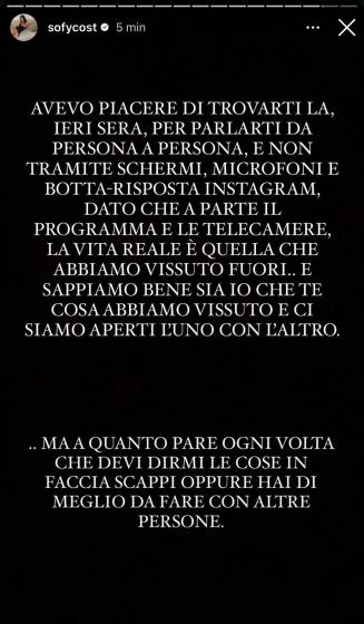 Avevo piacere di trovarti là, ieri sera, per parlarti da persona a persona, e non tramite schermi, microfoni e botta-risposta Instagram, dato che a parte il programma e le telecamere, la vita reale è quella che abbiamo vissuto fuori… e sappiamo bene sia io che te cosa abbiamo vissuto e ci siamo aperti l’uno con l’altro. Ma a quanto pare ogni volta che devi dirmi le cose in faccia scappi oppure hai di meglio da fare con altre persone.