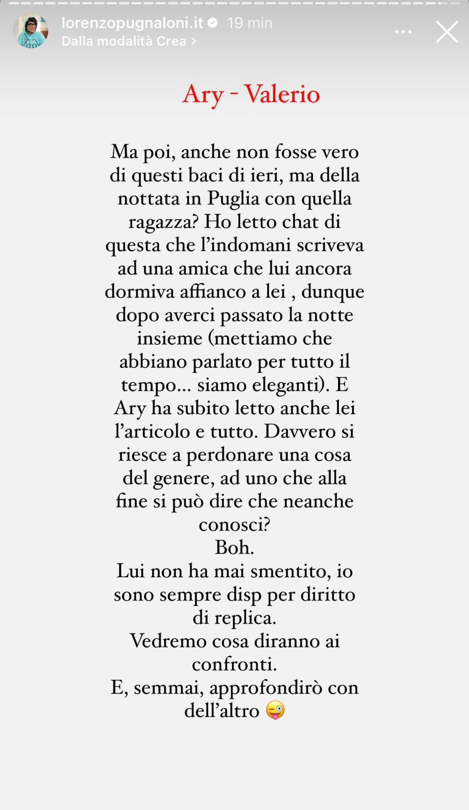 Sebbene quindi Ary e Valerio si stiano continuano a conoscere, le segnalazioni sul loro conto non si arrestano. Lorenzo Pugnaloni in particolare, ha raccontato che negli scorsi giorni Ciaffaroni avrebbe baciato altre ragazze: