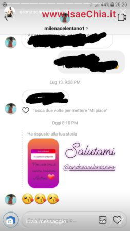 Ad alimentare l’incertezza è però intervenuto, qualche ora dopo, Oronzo stesso con una nuova Instagram Stories, in cui ha fatto lo screenshot di una conversazione con Milena Celentano, sorella di Andrea, che ha fatto nascere il dubbio che potrebbe essere stata lei l’autrice della domanda a cui lui aveva risposto.
