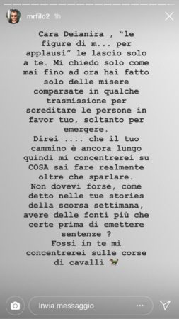 Vorrei dire al Signor Filomena che i miei gossip sono sempre comprovati, invece quando posto qualche messaggio che mi scrivono le persone mi prendo sempre il beneficio del dubbio. Detto ciò tu come ti permetti di telefonare a una persona vicina a me e dire che io non devo postare messaggi ecc ecc, quando io sulla mia pagina faccio quello che voglio. Tu sei andato in tv a piangerti le corna. Ma ci rendiamo contro che io sono sul web da due anni, i miei video su Facebook spopolavano e tu che sei diventato famoso per le corna ti permetti di parlare di me? Ma lavati la bocca!