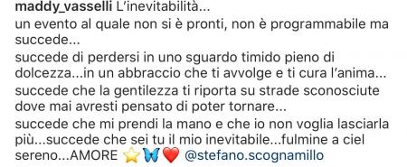 “Sei tu il mio inevitabile” ha scritto tra le altre cose Maddalena alla sua dolce metà, che dal canto suo ha ripostato la stessa foto accompagnata da un semplice ma eloquente cuoricino: