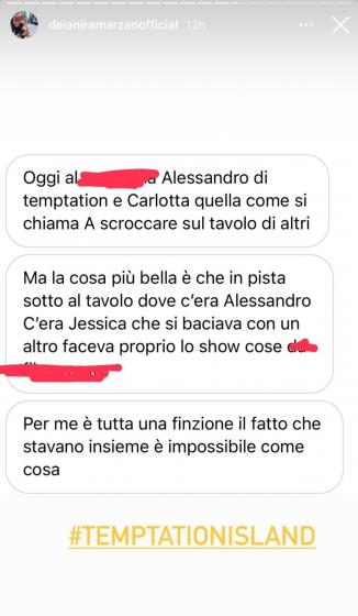 Pare dunque che Jessica e Alessandro si trovassero nello stesso locale e mentre lui era in compagnia di Carlotta, lei era intenta a scambiarsi baci con un altro ragazzo sotto gli occhi dell’ex. Questa scena ha fatto sorgere il dubbio che in realtà il loro sentimento fosse finito ormai da tempo, ancor prima di Temptation Island vista anche la poca complicità che i due hanno dimostrato nel corso del programma.
