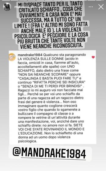 Mi dispiace tanto per il tanto criticato schiaffo. Cosa che ovviamente a casa non è mai successa. Ma a tutto c’è un limite. Fra l’altro mi sono fatta anche male io. La violenza psicologica è peggiore. E’ la cosa più brutta che tante volte non viene neanche riconosciuta.