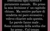 Non ho mai risposto a domande su di lui e mai lo farò. Mai nessuna frecciatina, ogni riferimento è puramente casuale. Ho preso la mia decisione, è un capitolo chiuso. Ma sentire parlare di vendetta mi pare eccessivo, volevo chiarire solo questo. Le parole fanno male. Sono contenta della scelta che ho preso. Col tempo dimenticherò questa esperienza che mi ha aiutata a crescere.