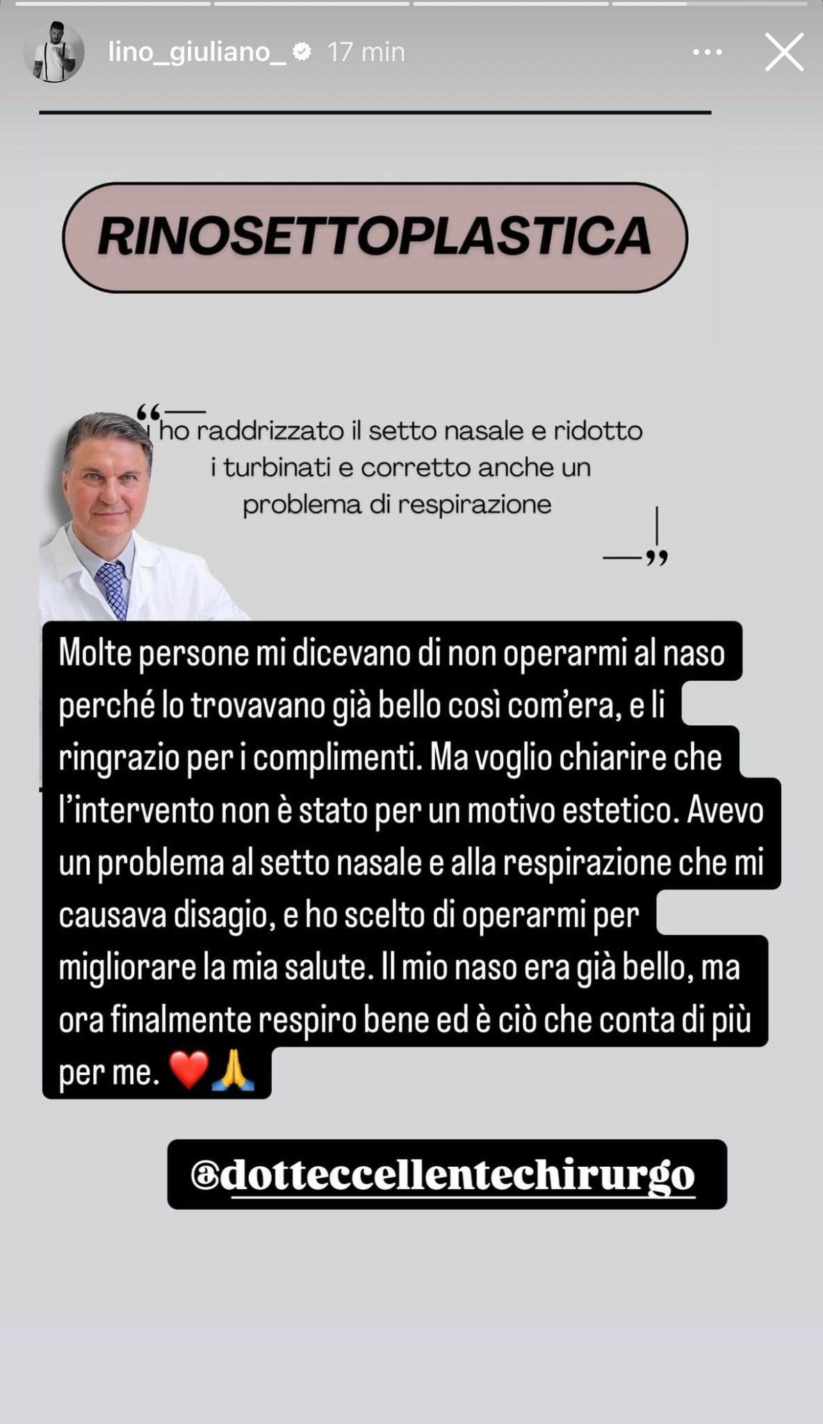 Lino, poi, nelle scorse ore ha pubblicato una storia sui social riprendendosi insieme ad Alessia con il naso fasciato e svelando così che entrambi si sono sottoposti ad un intervento per rifarsi il naso.
