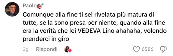 Comunque alla fine ti sei rivelata più matura di tutte, se la sono presa per niente, quando alla fine era la verità che lei VEDEVA Lino ahahaha, volendo prenderci in giro.
