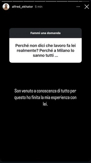 Ekhator ha risposto anche ad altre domande in merito alla sua frequentazione con Sofia, spiegando anche che il loro flirt si sarebbe concluso anche per via del lavoro della ragazza: stando a quanto riportato, infatti, il suo lavoro non sarebbe la modella e la studentessa di medicina veterinaria, ma un altro: “Son venuto a conoscenza di tutto per questo ho finita la mia esperienza con lei”, ha raccontato il ragazzo.
