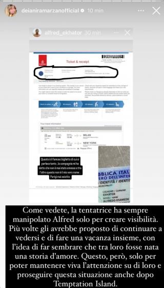 Alfred, infatti, ha pubblicato nelle sue storie Instagram il biglietto per New York che avrebbe acquistato Sofia, spiegando i motivi per cui in realtà questi biglietti non sarebbero veri: