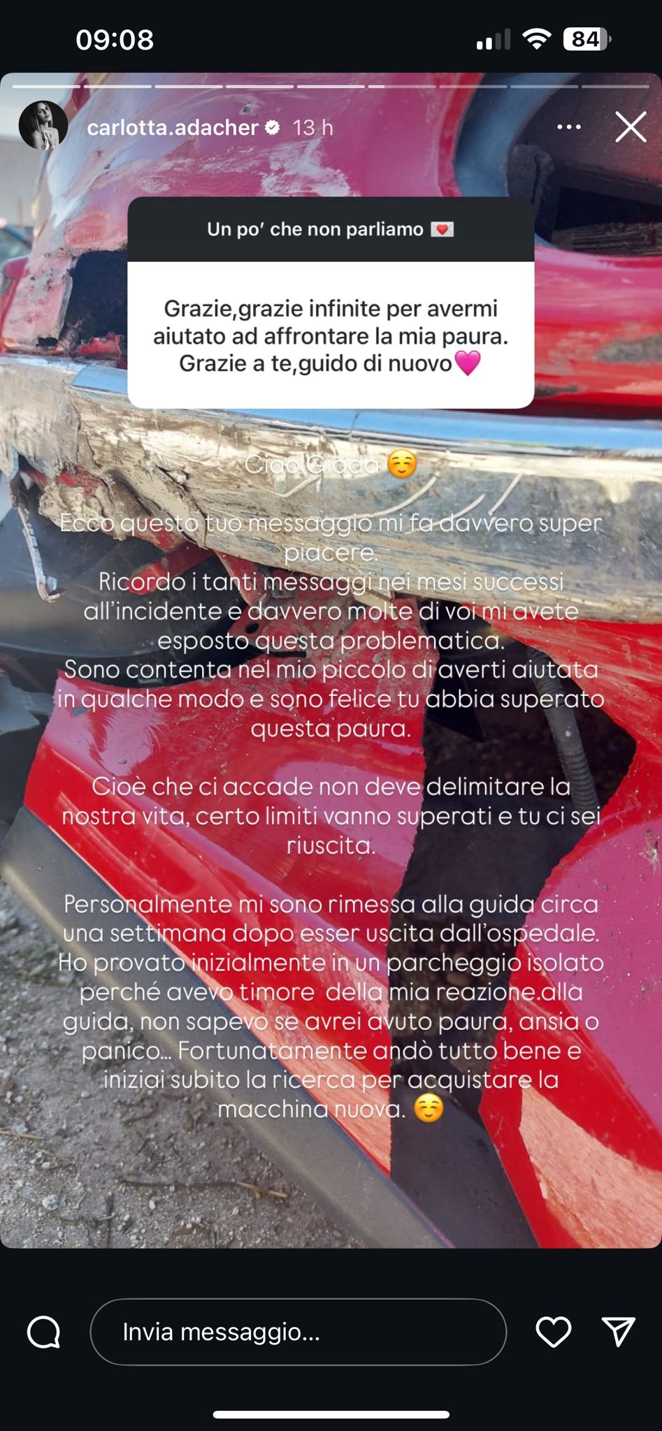 Ecco questo tuo messaggio mi fa davvero super piacere. Ricordo i tanti messaggi nei mesi successivi all’incidente e davvero molte di voi mi avete esposto questa problematica. Sono contenta nel mio piccolo di averti aiutata in qualche modo e sono felice tu abbia superato questa paura. Cioè che ci accade non deve delimitare la nostra vita, certo limiti vanno superati e tu ci sei riuscita. Personalmente mi sono rimessa alla guida circa una settimana dopo esser uscita dall’ospedale. Ho provato inizialmente in un parcheggio isolato perché avevo timore della mia reazione alla guida, non sapevo se avrei avuto paura, ansia o panico. Fortunatamente andò tutto bene e iniziai subito la ricerca per acquistare la macchina nuova.