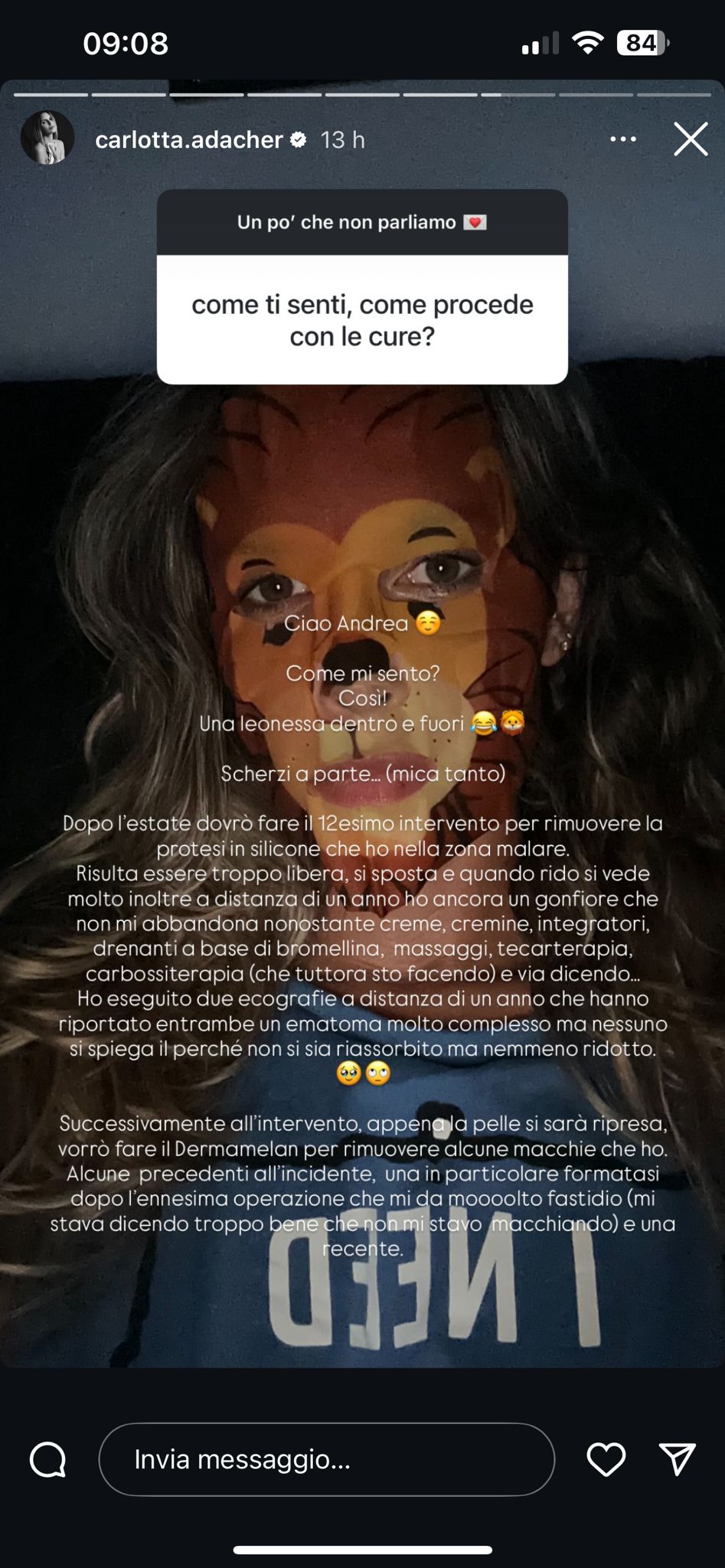 Una leonessa dentro e fuori. Scherzi a parte… (mica tanto). Dopo l’estate dovrò fare il 12esimo intervento per rimuovere la protesi in silicone che ho nella zona malare. Risulta essere troppo libera, si sposta e quando rido si vede molto inoltre a distanza di un anno ho ancora un gonfiore che non mi abbandona nonostante creme, cremine, integratori, drenanti a base di bromellina, massaggi, tecarterapia, carbossiterapia (che tuttora sto facendo) e via dicendo. Ho eseguito due ecografie a distanza di un anno che hanno riportato entrambe un ematoma molto complesso ma nessuno si spiega il perché non si sia riassorbito ma nemmeno ridotto. Successivamente all’intervento, appena la pelle si sarà ripresa, vorrò fare il Dermamelan per rimuovere alcune macchie che ho. Alcune precedenti all’incidente, una in particolare formatasi dopo l’ennesima operazione che mi dà moooolto fastidio (mi stava dicendo troppo bene che non mi stavo macchiando) e una recente.