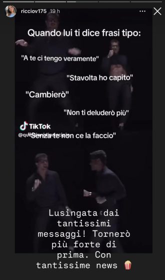 Valentina, infatti ha repostato un TikTok che afferma “Quando lui ti dice frasi tipo: a te ci tengo veramente, stavolta ho capito, cambio, non ti deluderò più, senza di te non ce la faccio” per poi aggiungere: