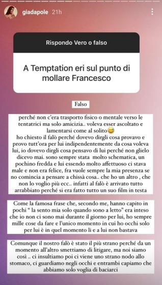 Nelle ultime ore, poi, interrogata dai suoi followers, Giada ha voluto commentare col senno di poi la loro esperienza nel reality di Filippo Bisciglia.