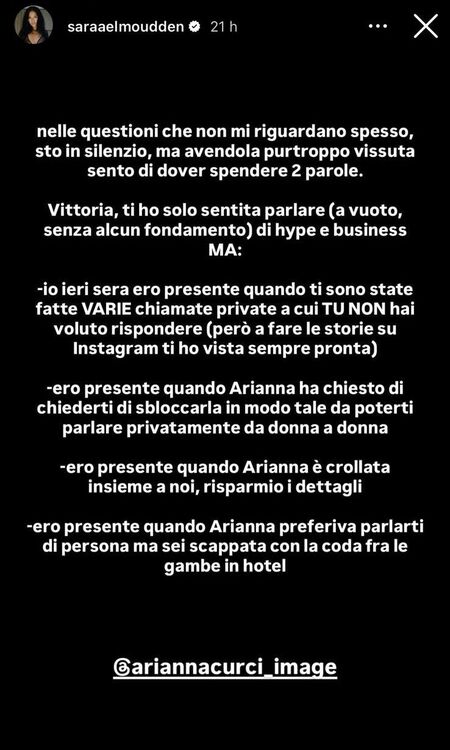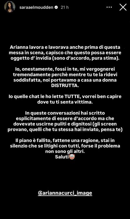 Arianna lavora e lavorava anche prima di questa messa in scena, capisco che questo possa essere oggetto d’invidia (sono d’accordo, pura stima). Io, onestamente, fossi in te, mi vergognerei tremendamente perché mentre tu te la ridevi soddisfatta, noi portavamo a casa una donna DISTRUTTA. Io quelle chat le ho lette TUTTE, vorrei ben capire dove tu ti senta vittima. In queste conversazioni hai scritto esplicitamente di essere d’accordo ma che dovevate uscirne puliti e dignitosi (gli screen provano, quelli che tu stessa hai inviato, pensa te). Il piano è fallito, fattene una ragione, stai in silenzio che se litighi con tutti, forse il problema non sono gli altri. Saluti