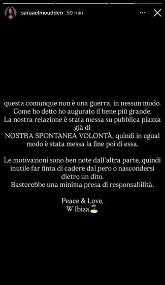 Questa comunque non è una guerra, in nessun modo. Come ho detto ho augurato il bene più grande. La nostra relazione è stata messa su pubblica piazza già di NOSTRA SPONTANEA VOLONTA’, quindi in egual modo è stata messa la fine poi di essa. Le motivazioni sono ben note dall’altra parte, quindi inutile far finta di cadere dal pero o nascondersi dietro un dito. Basterebbe una minima presa di responsabilità. Peace & love, W Ibiza.
