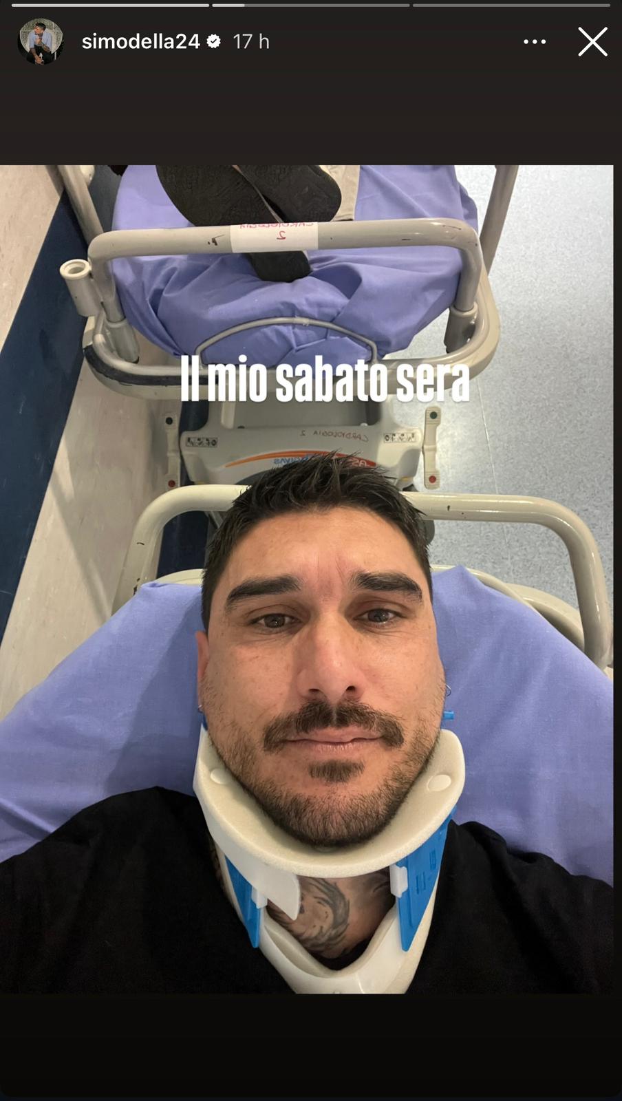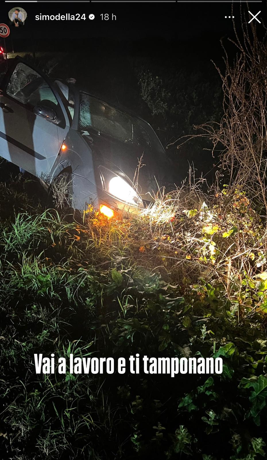 Dell’Agnello ha raccontato l’accaduto sui social, postando prima la foto dell’auto finita in un fosso e poi un selfie sul lettino d’ospedale, con un collare per immobilizzare il collo.