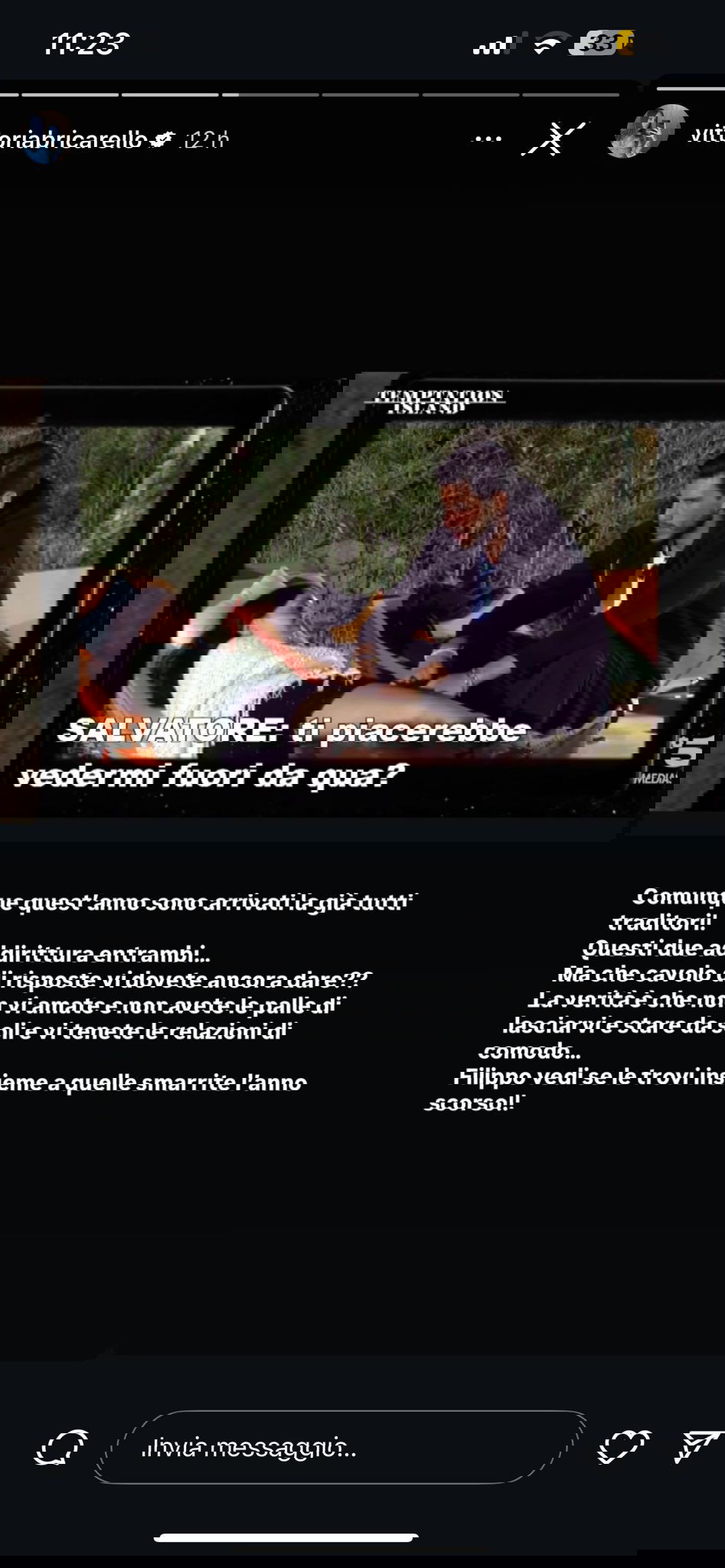 Comunque quest’anno sono arrivati la già tutti traditori! Questi due addirittura entrambi… Ma che cavolo di risposte vi dovete ancora dare?? La verità è che non vi amate e non avete le palle di lasciarvi e stare da soli e vi tenete le relazioni di comodo… Filippo vedi se le trovi insieme a quelle smarrite l’anno scorso!!