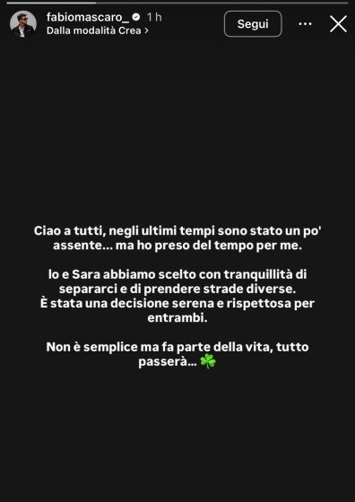 Ciao a tutti, negli ultimi tempi sono stato un po’ assente… ma ho preso del tempo per me. lo e Sara abbiamo scelto con tranquillità di separarci e di prendere strade diverse. È stata una decisione serena e rispettosa per entrambi. Non è semplice ma fa parte della vita, tutto passerà…