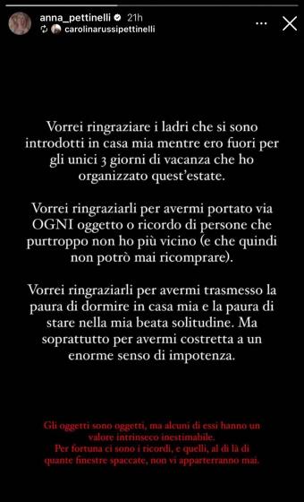 La Pettinelli è stata protagonista di uno spiacevole evento nelle ultime ore: un furto in casa. Con un lungo sfogo su Instagram, ha voluto “ringraziare” gli autori del gesto per averle distrutto gli ultimi ricordi che aveva delle persone a lei care, ormai scomparse: