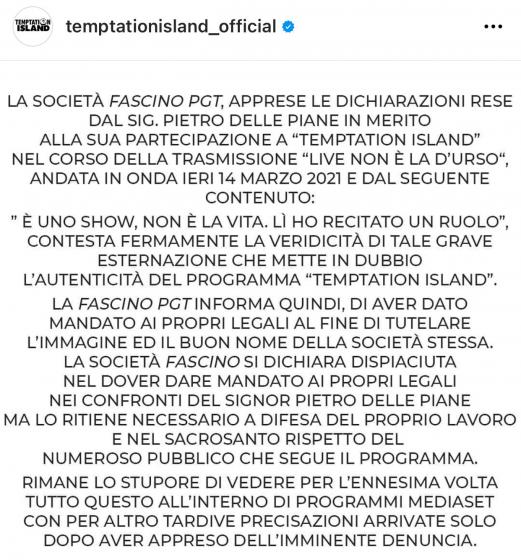 “La Società Fascino PGT, apprese le dichiarazioni rese dal Sig. Pietro Delle Piane in merito alla Sua partecipazione a Temptation Island nel corso della trasmissione Live – Non è la D’urso andata in onda ieri, 14 marzo 2021, e dal seguente contenuto: ‘È uno show, non è la vita. Lì ho recitato un ruolo‘, contesta fermamente la veridicità di tale grave esternazione che mette in dubbio l’autenticità del programma Temptation Island. La Fascino PGT informa quindi, di aver dato mandato ai propri legali al fine di tutelare l’immagine ed il buon nome della società stessa“, hanno scritto.