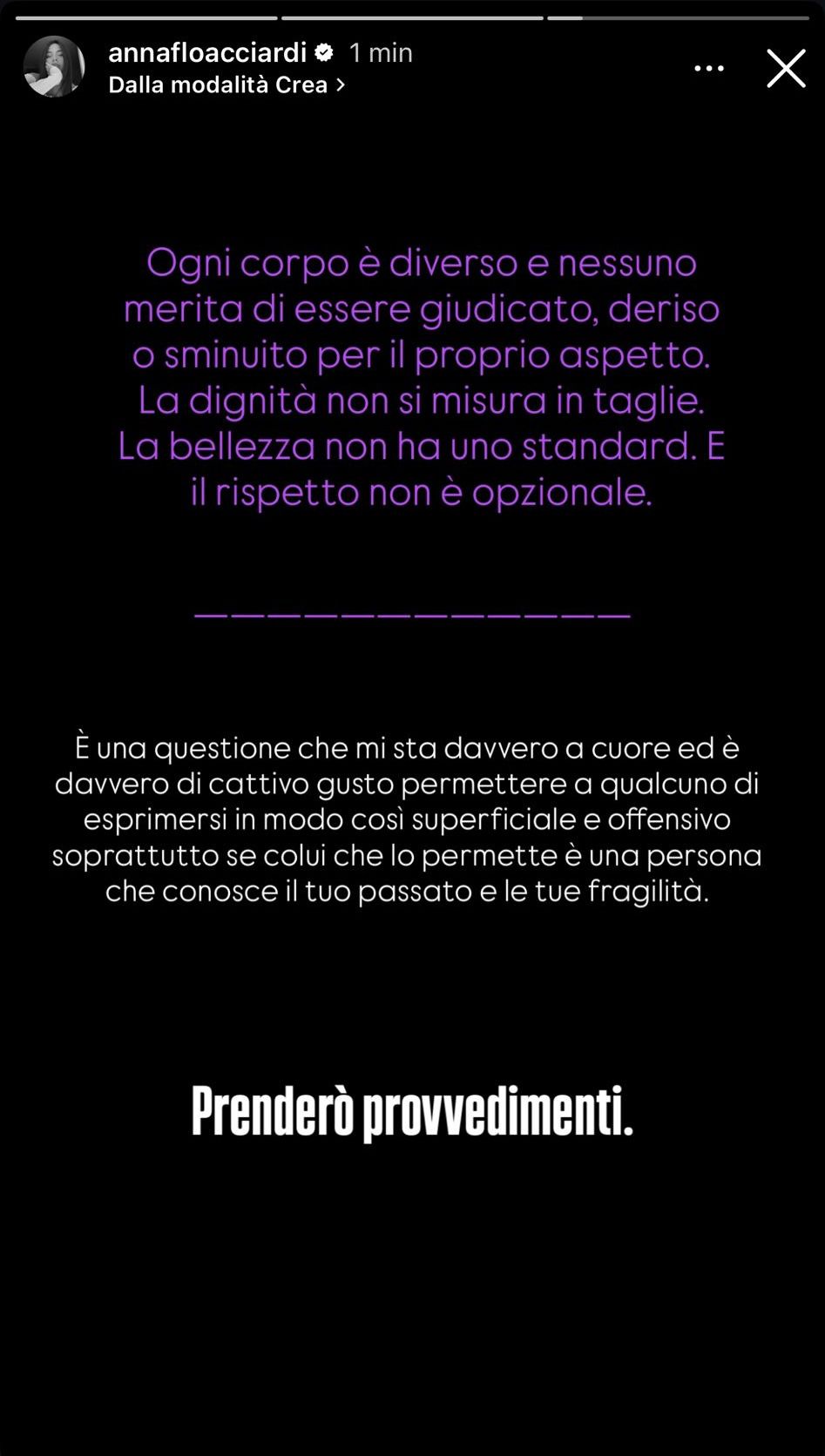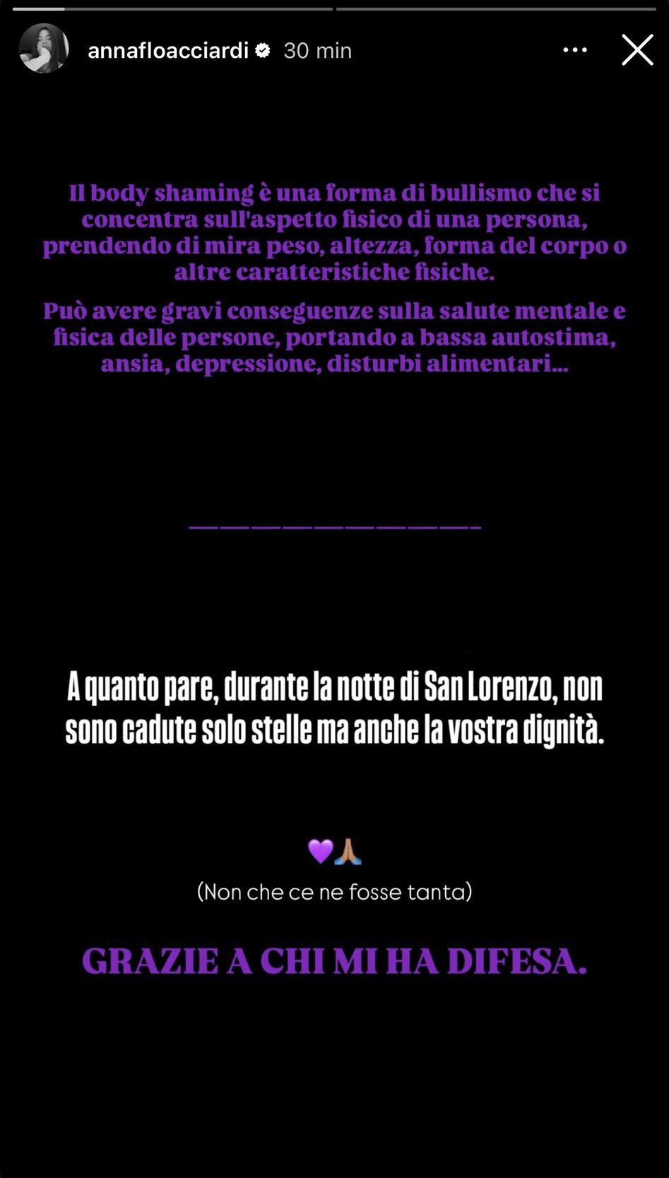 Lo sfogo di Anna è proseguito e, sempre attraverso le storie, ha voluto lanciare un lungo sfogo contro il body shaming. Inoltre, ha anche chiesto alle varie discoteche e brand di dissociarsi da Alfred e Marta: