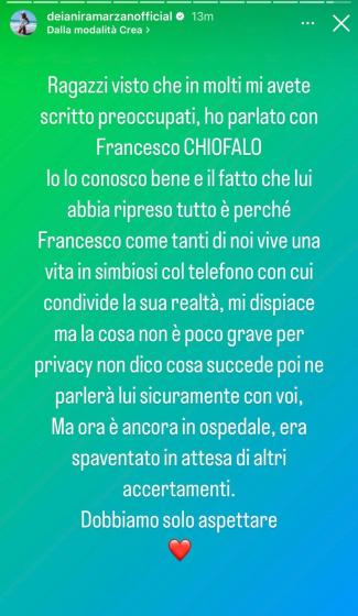 Ragazzi, visto che in molti mi avete scritto preoccupati, ho parlato con Francesco Chiofalo. Io lo conosco bene e il fatto che lui abbia ripreso tutto è perché Francesco come tanti di noi vive una vita in simbiosi con il telefono, con cui condivide la sua realtà, mi dispiace ma la cosa non è poco grave. Per privacy non dico cosa succede poi ne parlerà lui sicuramente con voi, ma ora era ancora in ospedale, era spaventato in attesa di altri accertamenti. Dobbiamo solo aspettare.