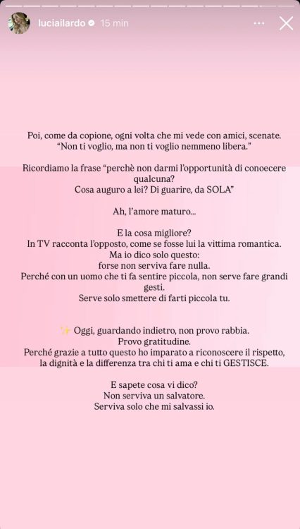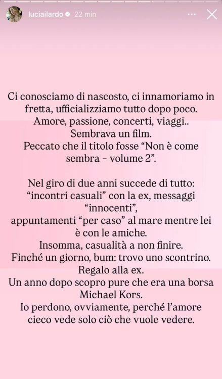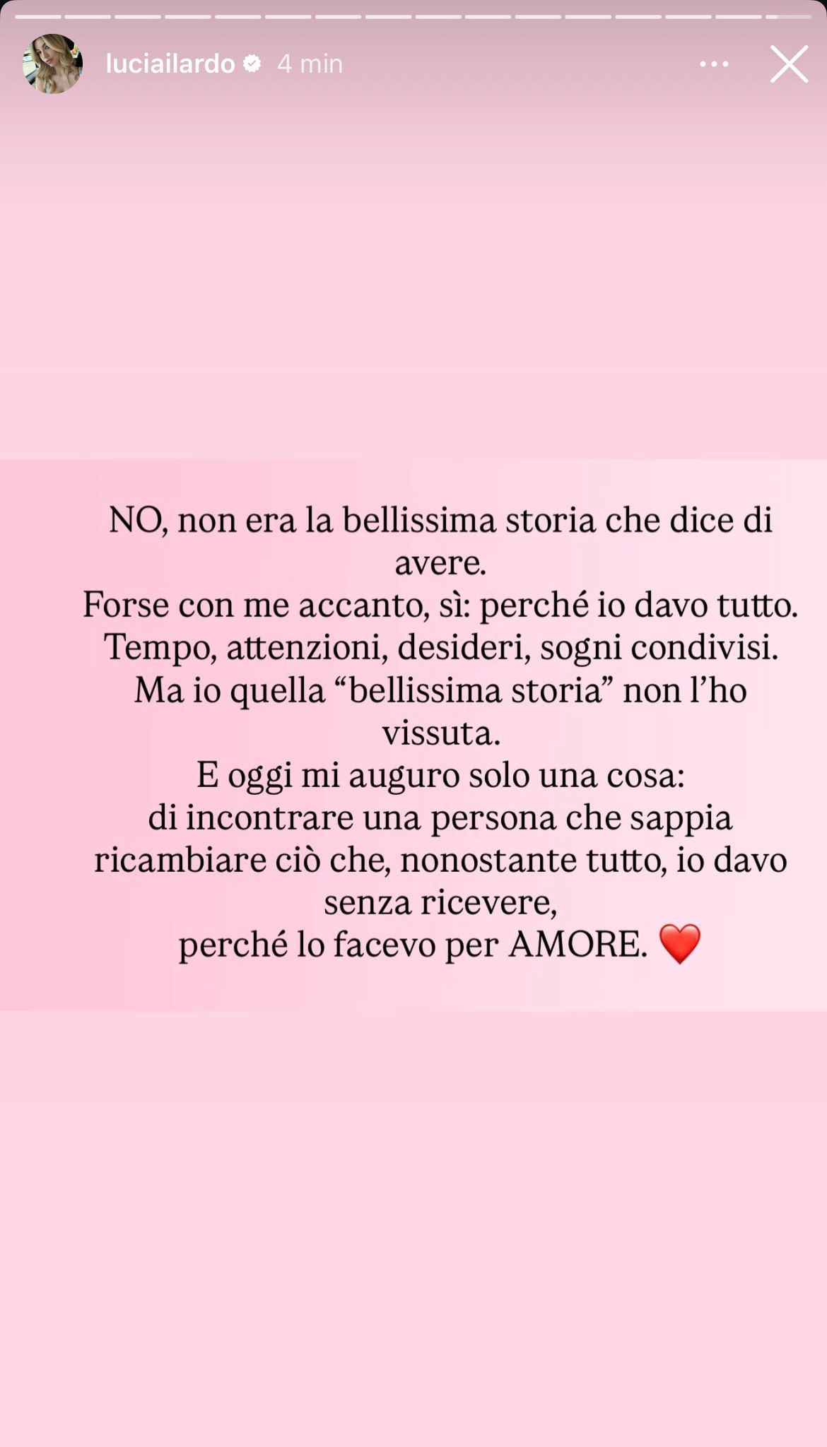 NO, non era la bellissima storia che dice di avere. Forse con me accanto, sì: perché io davo tutto. Tempo, attenzioni, desideri, sogni condivisi. Ma io quella “bellissima storia” non l’ho vissuta. E oggi mi auguro solo una cosa: di incontrare una persona che sappia ricambiare ciò che, nonostante tutto, io davo senza ricevere, perché lo facevo per AMORE