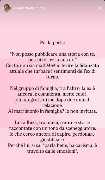 Poi la perla: “Non posso pubblicare una storia con te, potrei ferire la mia ex.” Certo, non sia mai! Meglio ferire la fidanzata attuale che turbare i sentimenti dell’ex di turno. Nel gruppo di famiglia, tra l’altro, la ex è ancora lì: commenta, mette cuori, più integrata di me dopo due anni di relazione. Al matrimonio in famiglia? Io non invitata. Lui a Ibiza, tra amici, serate e storie raccontate con un tono da sceneggiatore. Io che cerco ancora di capire, perdonare, giustificare. Perché lui, si sa, “parla bene, ha carisma, è travolto dalle emozioni.