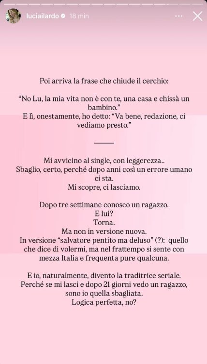 Poi arriva la frase che chiude il cerchio: “No Lu, la mia vita non è con te, una casa e chissà un bambino. E lì, onestamente, ho detto: “Va bene, redazione, ci vediamo presto. Mi avvicino al single, con leggerezza…
