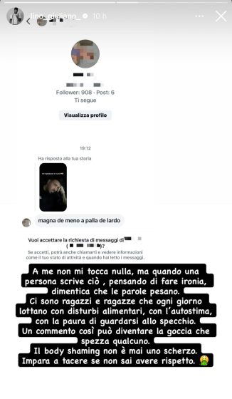 Subito dopo, l’ex concorrente del reality ha condiviso il messaggio ricevuto da un hater, riferito proprio al suo aspetto fisico: “Magna di meno palla di lardo”, sono state le parole scritte da un utente e rivolte a Lino, il quale non ha esitato a rispondere.