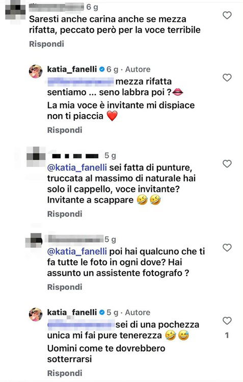 “Saresti anche carina anche se mezza rifatta, peccato però per la voce terribile. Sei fatta di punture, truccata al massimo, di naturale hai solo il cappello!“, le ha scritto un follower, e la sua risposta non è tardata ad arrivare. “Mezza rifatta? Sentiamo… Seno, labbra, poi? La mia voce è invitante, mi dispiace che non ti piaccia!” ha replicato Katia ammettendo di aver fatto ricorso alla chirurgia solo per quanto riguarda bocca e décolleté.