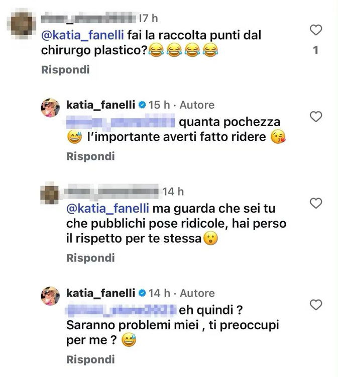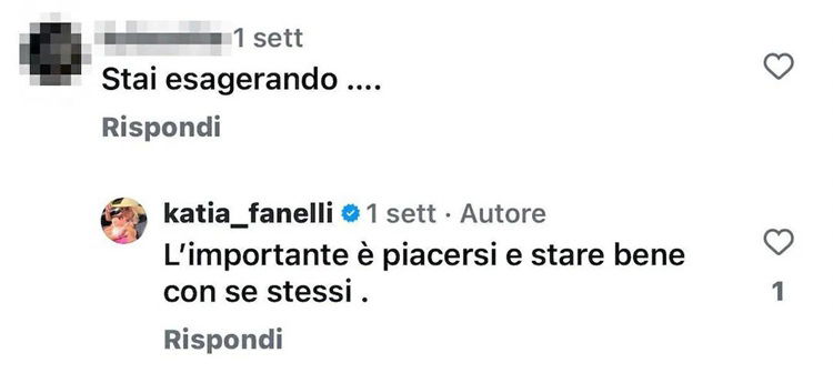 “Fai la raccolta punti dal chirurgo plastico? Pubblichi pose ridicole, hai perso il rispetto per te stessa” è stato il duro commento di un altro hater, a cui la Fanelli ha risposto con un sintetico “Quanta pochezza!“. E a chi le ha fatto notare che “stai esagerando“, la fotonica ha chiosato con un eloquente “l’importante è piacersi e stare bene con se stessi“.