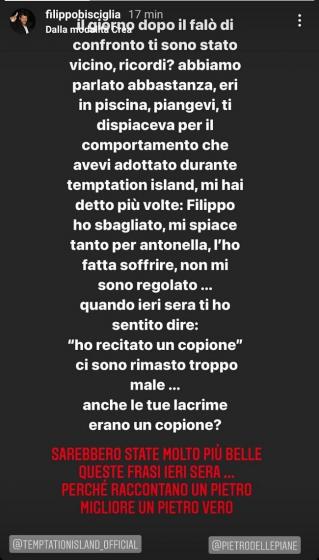 Ma non solo. Alcuni protagonisti di Temptation Island hanno deciso di scagliarsi contro le parole di Pietro, tra cui il conduttore Filippo Bisciglia, che tramite una Instagram Stories ha voluto manifestare il suo disappunto: