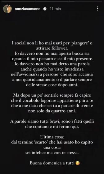 Ieri Nunzia è intervenuta su Instagram con un lungo sfogo: