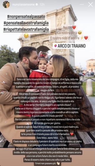 Sono così tanto innamorata del mio compagno, di mia figlia, della mia famiglia. […] Già prima di conoscere Flavio non pensavo mai al mio passato, quando chiudo un capitolo non lo rileggo più, figuriamoci adesso che ho un compagno che amo, mi ama e una figlia che è la nostra vita. A che serve ritornare a leggere un capitolo chiuso? Forse se si ritorna a leggerlo è perché non è completamente chiuso e i rimorsi dentro logorano nonostante si stia vivendo un altro capitolo[…]. Quando si scende da un treno ormai si è scesi non si può risalire più, guardate avanti e pensate alle prossime mete. Flavio, mi dispiace deludere il pensiero di qualcuno ma è un uomo, un padre e un compagno futuro marito eccezionale.