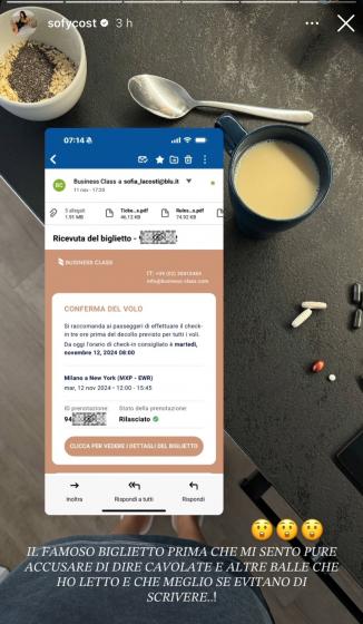 Ma un dettaglio in questa immagine pubblicata dalla Costantini non è sfuggito ai fan. Infatti delle segnalazioni sono giunte a Deianira Marzano, esperta di gossip, che ha riportato i sospetti dei followers riguardo la data del biglietto, che risalirebbe all’11 novembre, confermando di fatto l’ipotesi di un acquisto recente e non precedente, come dichiarato dalla ragazza: