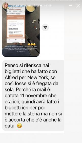 Penso si riferisca aai biglietti che ha fatto con Alfred per New York, se così fosse si è fregata da sola. Perché la mail è datata 11 novembre che era ieri, quindi avrà fatto i biglietti ieri per poi mettere la storia ma non si è accorta che c’è anche la data.