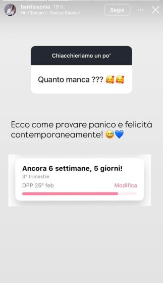 A proposito del nascituro, manca sempre meno al parto e Sonia nelle scorse ore, rispondendo alla domanda di un suo follower, ha svelato quanto manca esattamente: la data presunta del parto è fissata al 25 febbraio e mancano quindi sei settimane e cinque giorni. Un evento che la Barrile ha così commentato: “Ecco come provare panico e felicita contemporaneamente!”.
