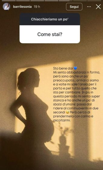 Sto bene dai. Mi sento abbastanza in forma, però sono anche un po’ preoccupata… ormai ci siamo e a volte mi sale l’ansia per il parto e per tutto quello che sta per cambiare. In più in questo periodo mi sento super stanca e ho anche un po’ di sbalzi d’umore: passo dal ridere al commuovermi in due secondi e Però cerco di prendermela con calma e ascoltarmi.