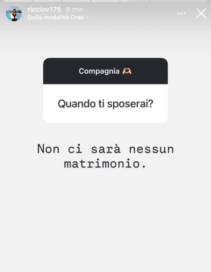 A conferma del fatto che tra la Riccio e Panico non ci sia attualmente alcun ritorno di fiamma è stata la diretta interessata, che nelle scorse ore ha risposto ad alcune domande dei suoi followers, chiarendo che il matrimonio non si farà: “non ci sarà nessun matrimonio” è stata infatti la lapidaria risposta a chi le ha chiesto quando si sarebbero tenute le nozze.