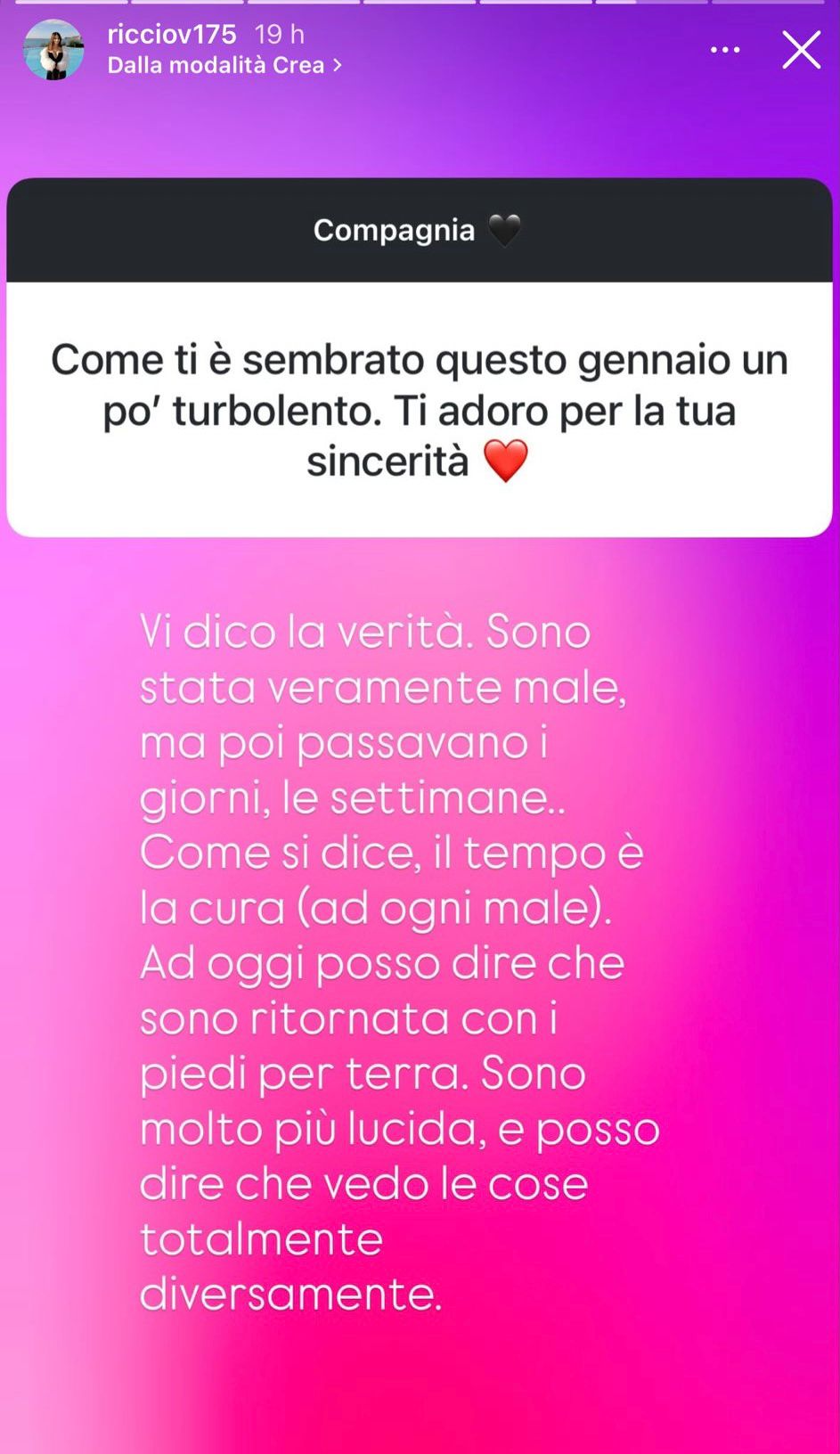 Vi dico la verità. Sono stata veramente male, ma poi passavano i giorni, le settimane.. Come si dice, il tempo è la cura (ad ogni male). Ad oggi posso dire che sono ritornata con i piedi per terra. Sono molto più lucida, e posso dire che vedo le cose totalmente diversamente. Adesso sto decisamente meglio! sono più serena, e soprattutto non rincorro più nessuno. Questa cosa mi fa stare bene.