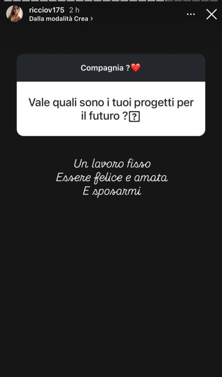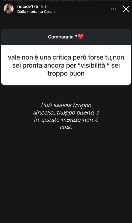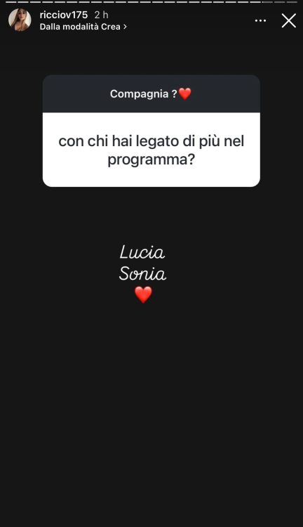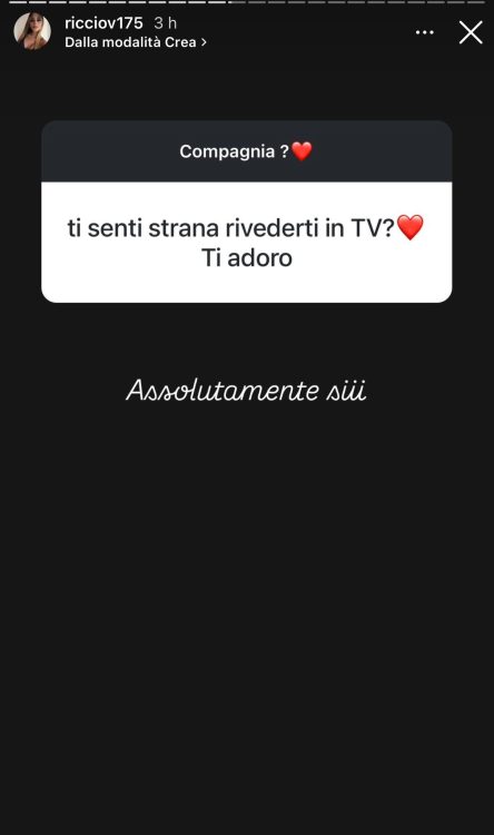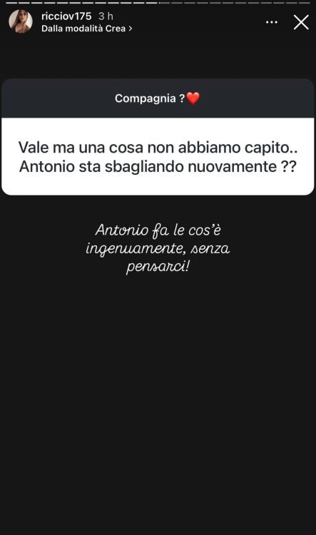 Poi ci tenevo tanto a rispondere alla domanda più richiesta: io ho scritto alla ragazza in questione ci siamo chiarite però ragioniamo completamente su due binari diversi, detto ciò per me la questione si è chiusa ieri sera con questa ragazza, riguardo Antonio la stiamo risolvendo. Lui purtroppo ha sbagliato perché non me lo ha detto subito, però ci sono rimasta non male, di più.