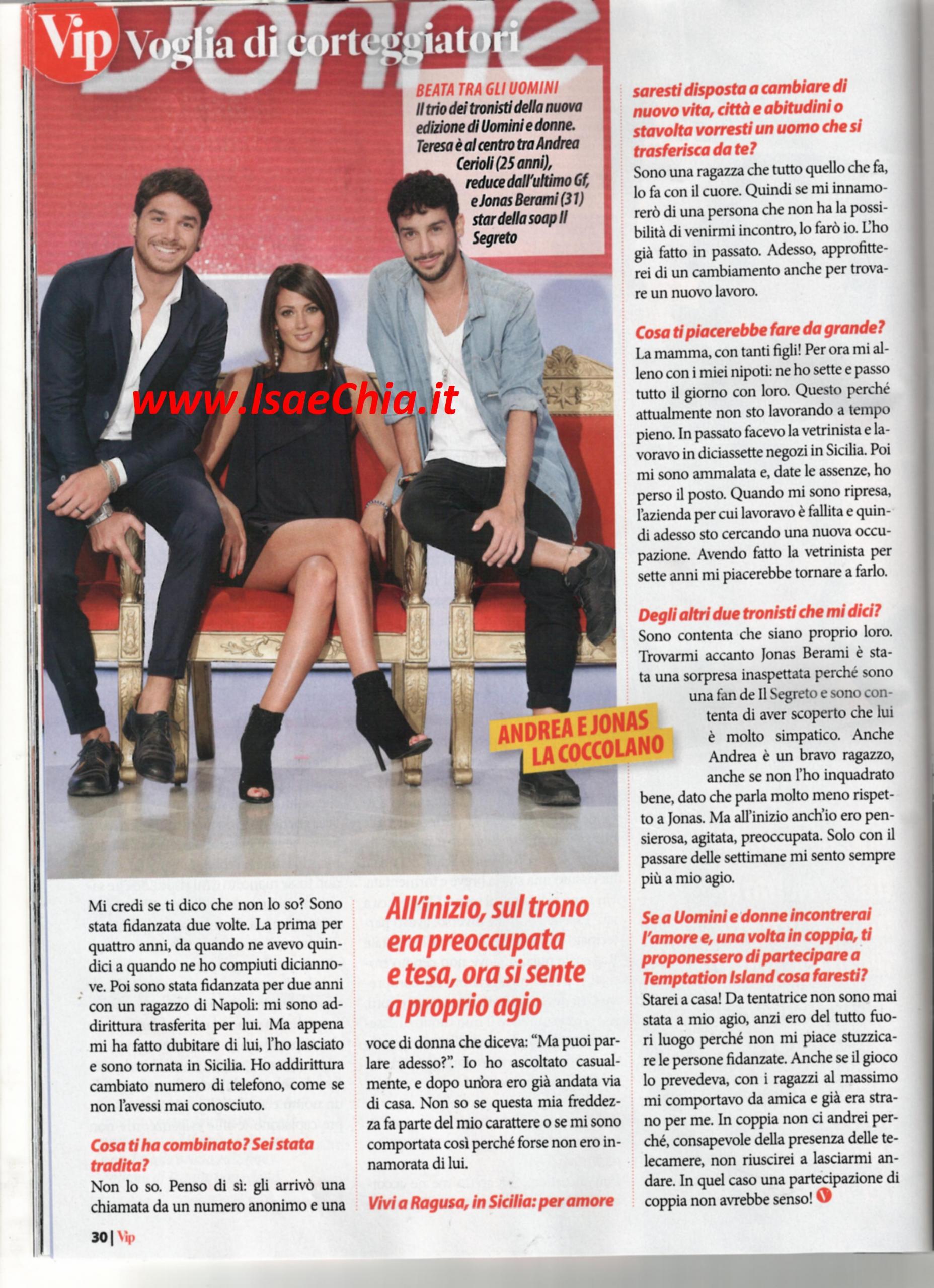 Dopo un’esperienza come tentatrice a Temptation Island, Teresa Cilia non immaginava che le sarebbe stato proposto il trono di Uomini e donne: “Ogni volta ci speravo, non sono ipocrita, ma ogni volta rimanevo delusa. Quando avevo perso le speranze, mi hanno richiamata e ho addirittura pianto! Essere tronisti è diverso: ora devo essere attenta a tutto e tutti, ma senza cambiare il mio modo di essere spontanea. I corteggiatori potrebbero essere interessati solo alla visibilità, ma credo che me ne accorgerei. In tal caso, creo che li manderei a casa. Ma prima chiederei a Maria De Filippi di farne scendere altri! Finora mi ritengo fortunata, sono tutti bellissimi ragazzi. Spero che rispecchino il mio ideale di uomo: non ho grandi pretese, voglio una persona di carattere e sincera, che si occupi i me. Essendo cresciuta senza un padre, che è mancato quando ero piccola, sicuramente in un uomo ricerco una figura paterna. Quando ero piccola non me ne rendevo conto, ma poi ho capito che se lui ci fosse stato, io sarei cresciuta più felice. Mia madre ha cresciuto da sola me e altri tre figli e io non le ho mai detto che stavo male per non darle altri pensieri”. Quando le si chiede delle storie passate e se è mai stata innamorata, racconta: “Mi credi se ti dico che non lo so? Sono stata fidanzata due volte, la prima per 4 anni, dai 15 ai 19; la seconda, con un ragazzo di Napoli e mi ero trasferita per lui. Ma appena ho dubitato i lui, l’ho lasciato, sono tornata in Sicilia e ho cambiato numero. Gli arrivò una chiamata a un numero anonimo e una donna diceva: “Puoi parlare adesso?”. Dopo un’ora ero già via di casa. Se mi innamorerò di una persona che non ha la possibilità di venire a me a Ragusa, mi sposterò io: approfitterei di un cambiamento anche per trovare lavoro. In passato, ho fatto la vetrinista e lavoravo in 17 negozi in Sicilia, ma dopo la mia malattia, l’azienda è fallita e sto cercano nuova occupazione. Gli altri tronisti? Jonas Berami è stato una sorpresa perché guardo Il Segreto e l’ho scoperto molto simpatico. Andrea Cerioli è un bravo ragazzo ma non l’ho ancora inquadrato bene, perché parla meno di Jonas. Se dopo Uomini e donne mi fidanzassi e mi proponessero di partecipare a Temptation Island, starei a casa! Anche là, non mi piaceva il ruolo i tentatrice perché non amo stuzzicare chi è fidanzato: mi sono comportata da amica. Non ci andrei perché con le telecamere non saprei lasciarmi andare e quindi la partecipazione in coppia non avrebbe senso!”