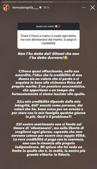 Nella stessa occasione, fra le domande, una in particolare ha infastidito Teresa, la follower infatti ha criticato l’influencer perché è partita per andare a trovare la famiglia, allontanandosi dal marito. Teresa a quel punto ha risposto per le rime: