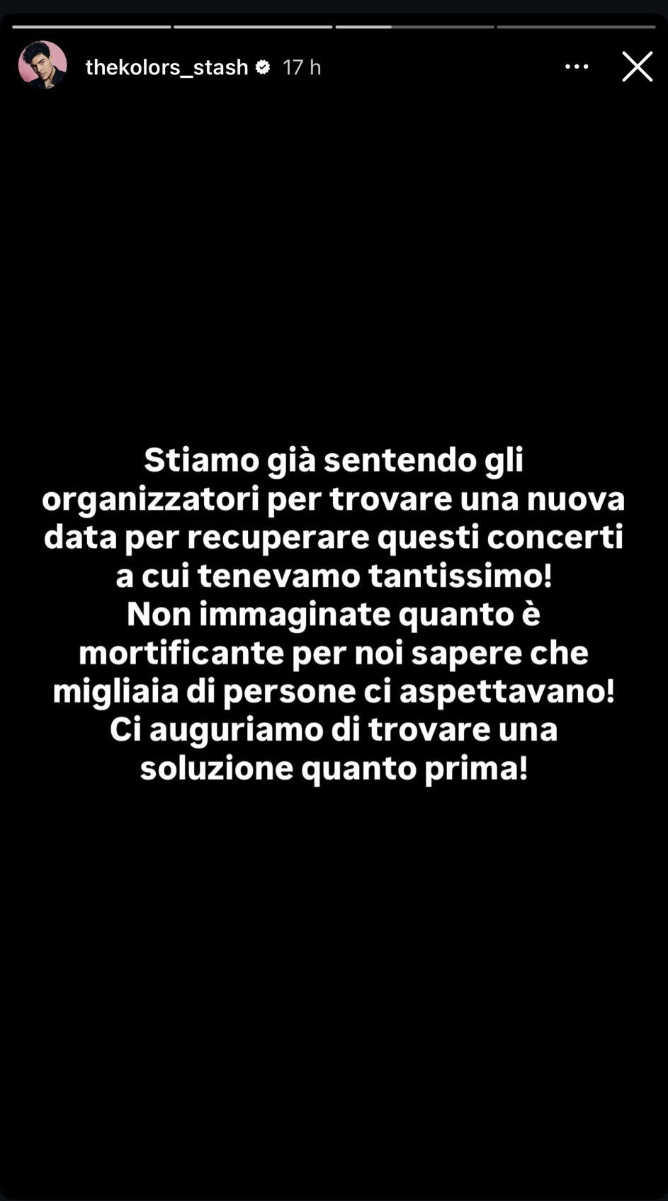 Ora è toccato al leader dei The Kolors, Stash Fiordispino, comunicare l’obbligo di annullare alcuni concerti per via delle sue condizioni di salute.